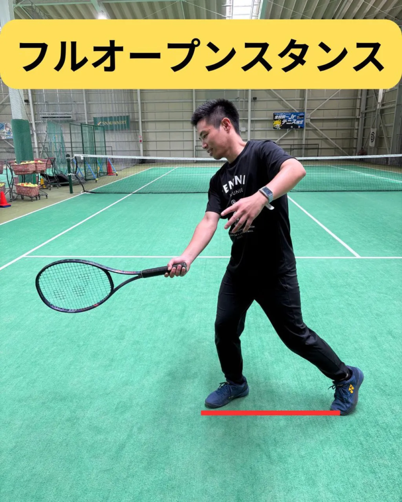 足を横に広げて打つので、打った瞬間にすぐに逆方向へ蹴り出せるんです。 「足が遅くて追いつかない」と感じている方は、あえてフルオープンで打ってみると、次のボールへの準備が驚くほど速くなるかもしれません!